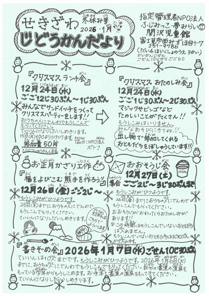 あそびの学校 勝瀬原記念公園 2015 4/23 活動報告<関沢児童館> 2015年4月23日 あそびの学校 勝瀬原記念公園 新緑が美しい勝瀬原記念公園。 今日は新聞紙遊びをしました。 かけっこでビリッと破った新聞紙を使って、フリスビー作り! できあがったフリスビーを投げて、とても楽しそうでした。 最後は、木陰で紙芝居を見ました。 来週は、こいのぼり製作をします。 お楽しみに♪ 活動報告<関沢児童館> あそびの学校 つるせ台公園 あっぷっぷ 関連記事 11月の関沢児童館 2025年11月29日 秋まつりIN関沢児童館 2025年10月31日 10月の関沢児童館 2025年10月31日 9月の関沢児童館 2025年9月29日 夏休みの関沢児童館 2025年8月29日 7月の関沢児童館 2025年7月31日 6月の関沢児童館 2025年6月27日 5月の関沢児童館 2025年5月28日