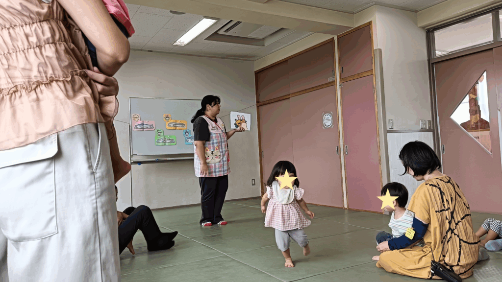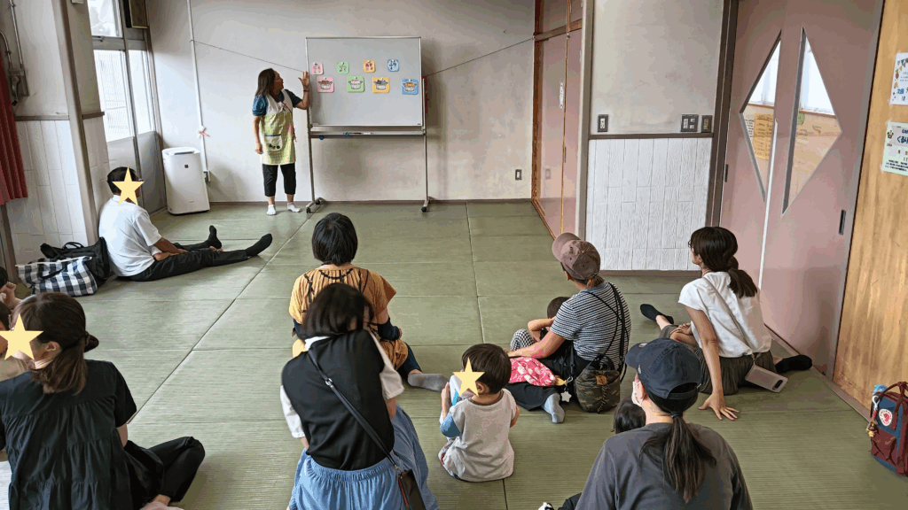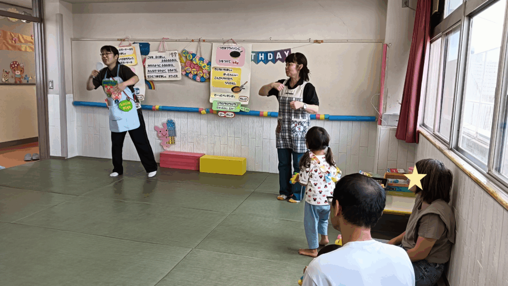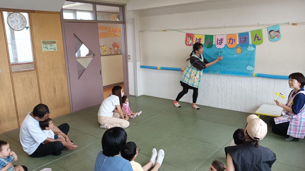 旬の食材をテーマにしたペープサートやかくれんぼした動物をあてるペープサートにみんな興味津々。八百屋さんの歌もうたってみんなで盛り上がりました!