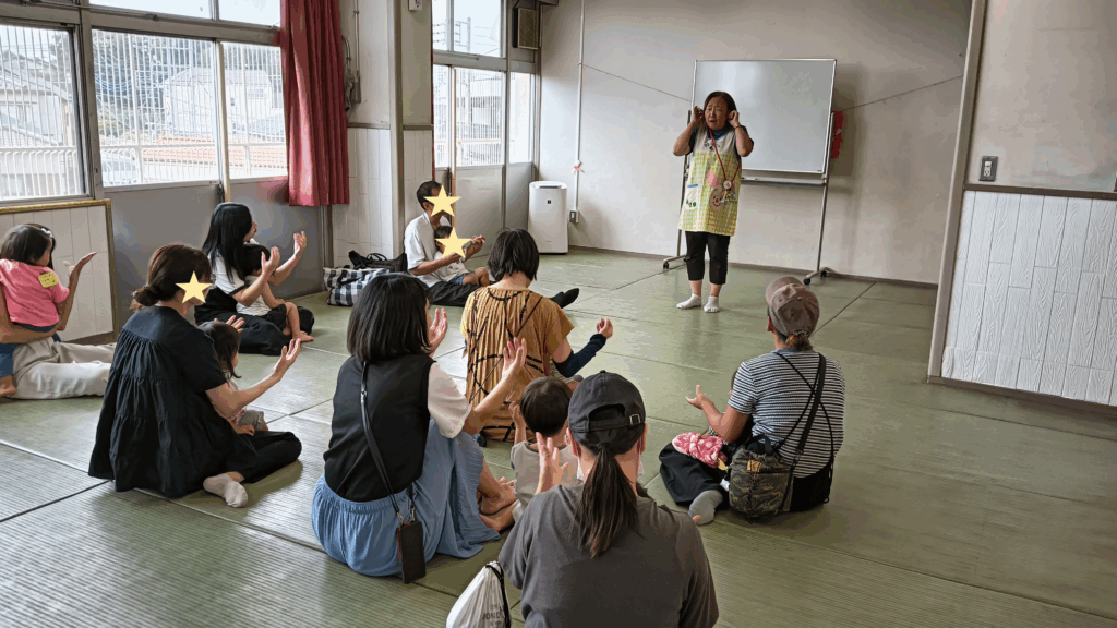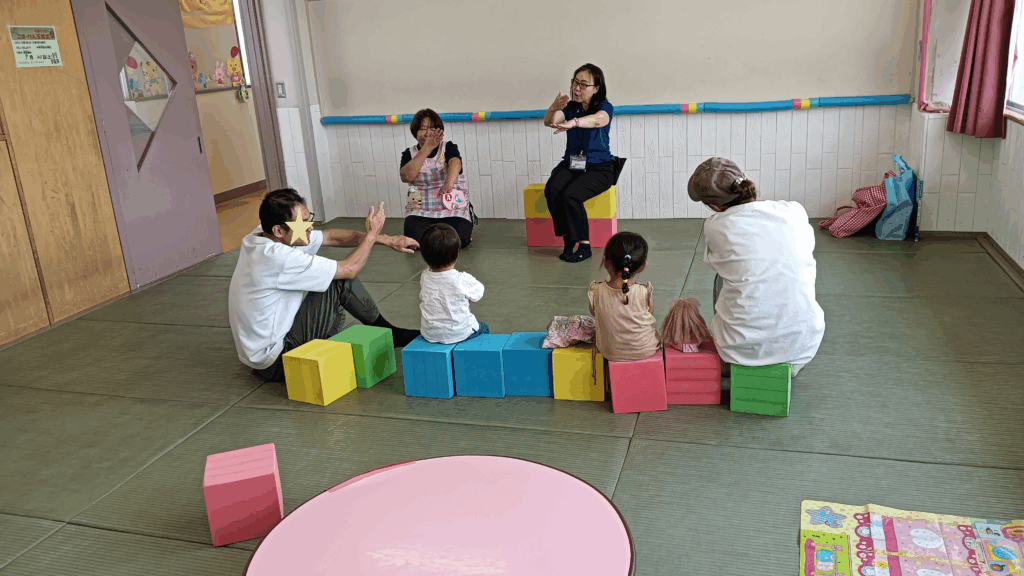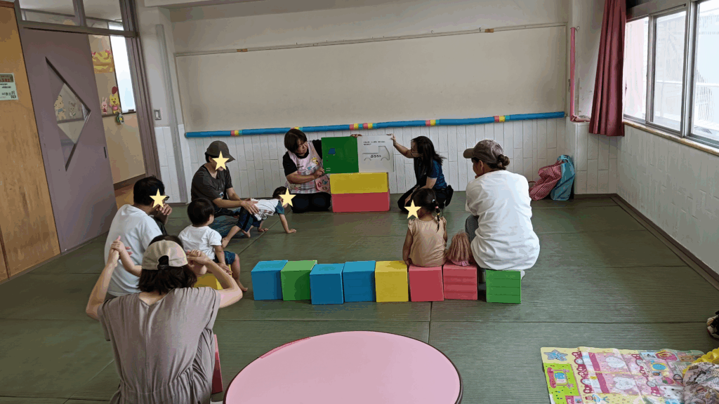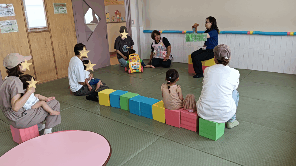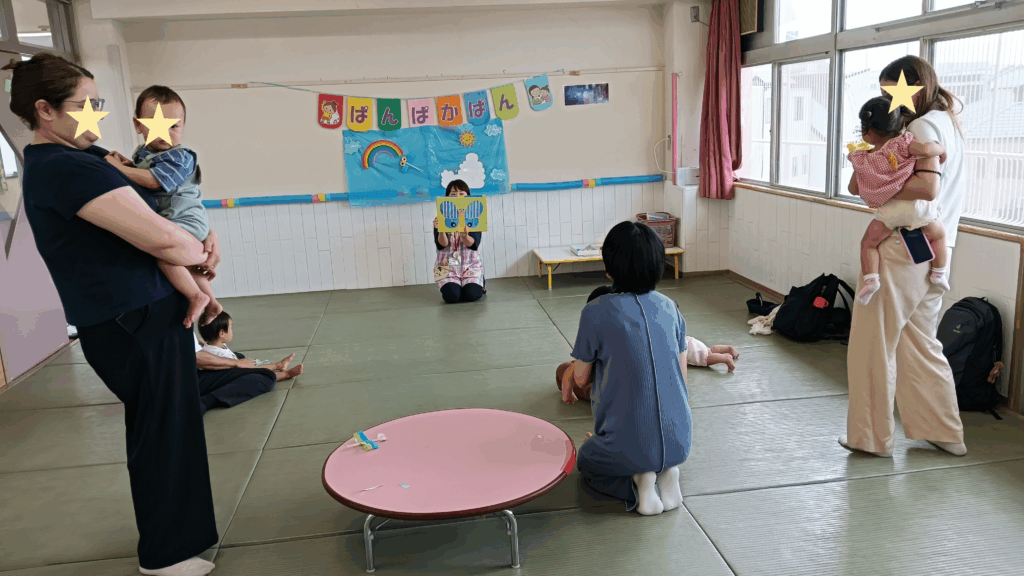 今月は市立図書館西分館より読み聞かせに来て頂きました。人形を使ったわらべうたや大型絵本など、いつもとちょっと違うおはなしタイムをみんなで楽しみました!