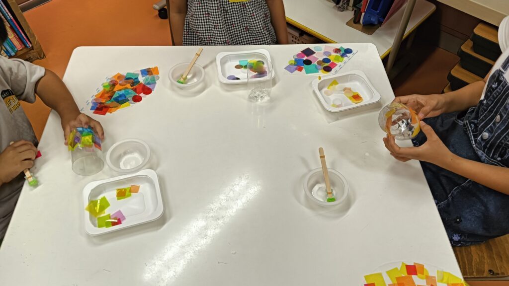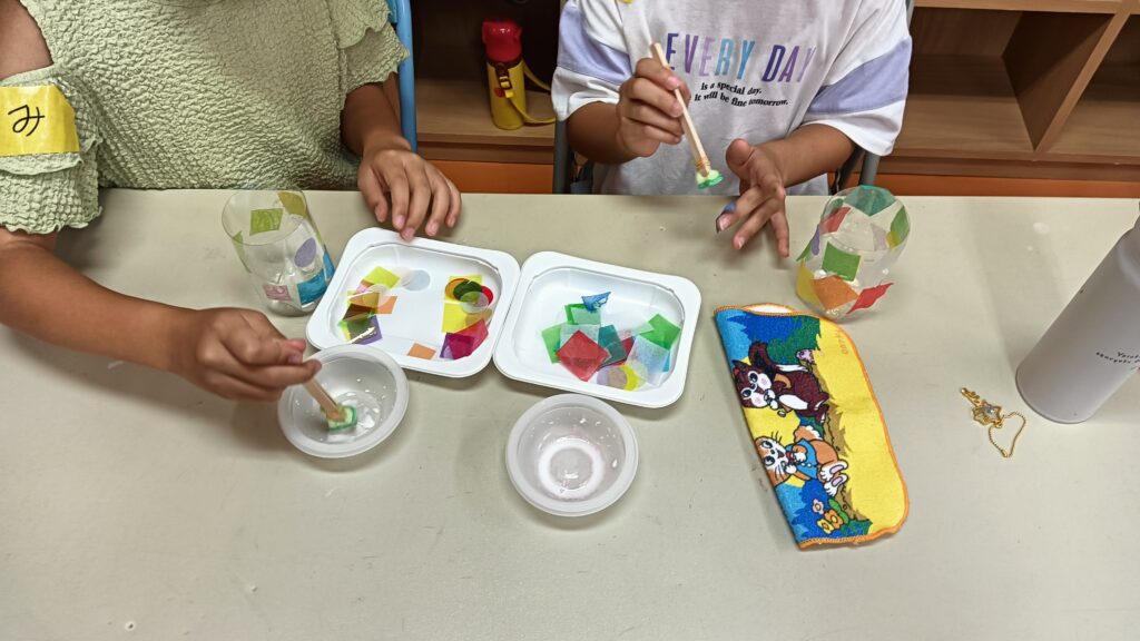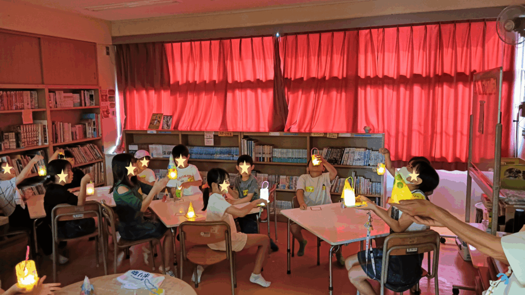 今回はペットボトルでランタンを、クリアファイルでランプシェードを作りました。最後は部屋の照明を消してみんなで点灯式を行いました!