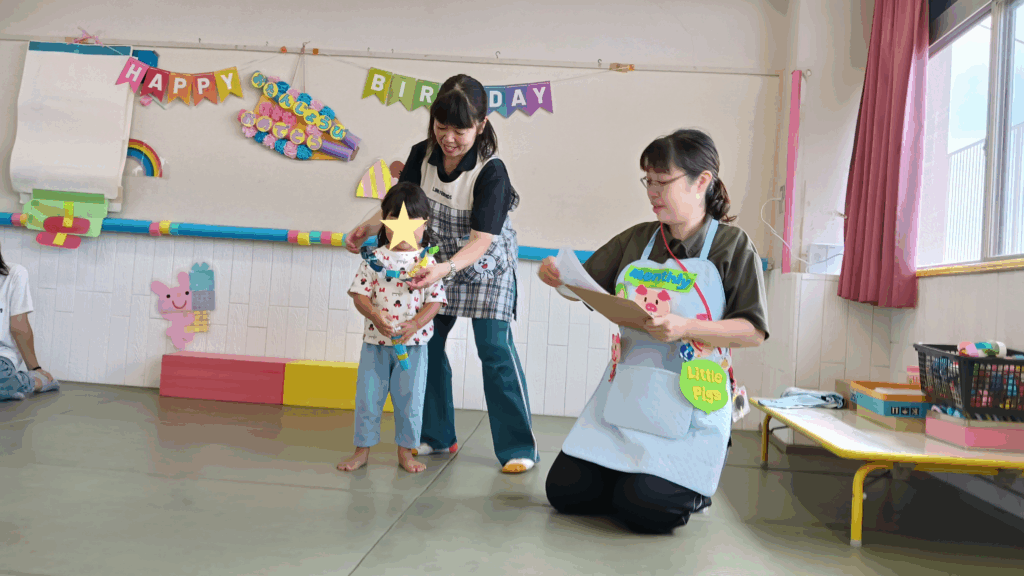 9月生まれのおともだちが3人参加してくれました。お誕生日月でないおともだちも一緒にみんなでシャインマスカットのケーキでお祝いをしました!