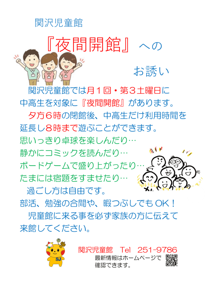 今月の夜間開館は4月18日(土)です! 2026 4/14 関沢児童館 お知らせ<関沢児童館> 2026年4月14日 中高生のみなさん、今年度も毎月第3土曜日に夜間開館開催します。 新中1生のみなさんも、ぜひぜひご参加下さい。(そのときには家族に児童館に来ることをつたえてくださいね) 関沢児童館 お知らせ<関沢児童館> 『あそびの学校AM版』中止のお知らせ こどもの日(5月5日)開館してます! 関連記事 こどもの日(5月5日)開館してます! 2026年4月14日 『あそびの学校AM版』中止のお知らせ 2026年4月10日 午後のあそびの学校 2026年4月7日 今月の夜間開館は3月21日(土)です! 2026年3月17日 『あそびの学校AM版』中止のお知らせ 2026年2月25日 今月の夜間は明日(2月21日)です。 2026年2月20日 合同消防訓練 2026年1月23日 Mamas’Meeting(ママズ ミーティング)ママの情報交換の場 2026年1月15日